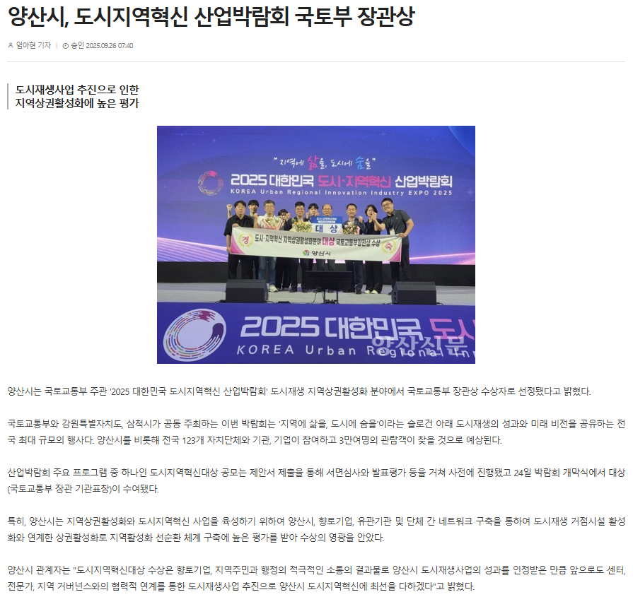 [양산] 양산시, 도시지역혁신 산업박람회 국토부 장관상